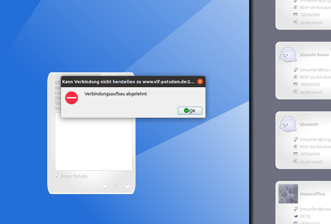 Created attachment 1367 [details] Fehlermeldung x2go Sicad nach Passworteingabe auf der x2go Oberfläche wird die auf dem Screenshot zu sehende Fehlermeldung angezeigt. Das Problem tritt nur bei Aufrufen von Sicad auf. Start der ABO Oberfläche funktioniert. Ich arbeite heute von Angermünde aus.