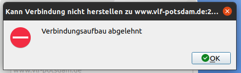 Created attachment 1378 [details] Screenshot Mit x2go kann keine Verbindung zu Potsdam Extern hergestellt werden. Fehlermeldung: "Verbindungsaufbau abgelehnt" Die Sitzungseinstellungen haben vor kurzem noch funktioniert.