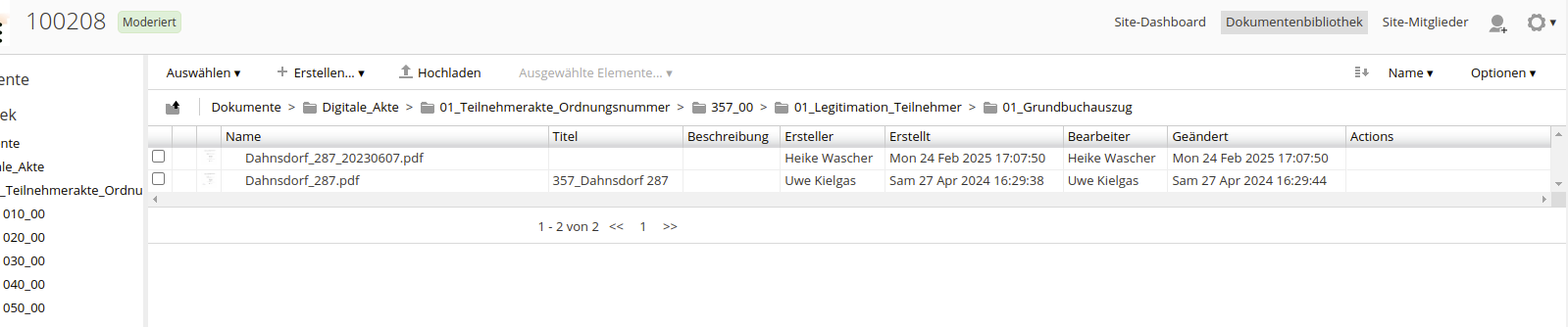 Created attachment 1890 [details] Verzeichnis im Alfresco Über Krusader wurden GB als pdf-Dateien in die Ordner im Alfresco verschoben/kopiert (s. Anhang). Diese Dateien können im Alfresco nicht angezeigt werden bzw. nur vereinzelte Seiten vom Dokument sind sichtbar. Das vollständige Anzeigen ist nur dann möglich, wenn die Datei heruntergeladen wird. Fast so ähnlich dem Verhalten vieler Dateien nach dem Crash. Lässt sich das nachträglich beeinflussen? Auf diese Weise sind fast 90 % alle GB in das Verfahren OU Dahnsdorf (100208) verschoben worden. Ein Erneutes Ziehen der Grundbücher ist mit einem erheblichen Aufwand verbunden.