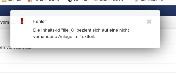 Created attachment 2023 [details] Bildschirmfoto mit Fehlermeldung Es ist nicht mehr möglich, an einem Kalendereintrag einen Anhang (z.B. eine abgespeicherte Mail) anzuhängen. Auch das Löschen des Anhanges führt zu keiner Lösung. Der Kalendereintrag muss neu ohne Anhang erstellt werden. Die Größe des Anhanges spielt keine Rolle; die Fehlermeldung erscheint immer. Der Fehler ist übrigens schon einmal aufgetreten und Uwe konnte diesen beheben. Ich würde mich über eine kurzfristige Lösung freuen, da ich die Kalendereinträge intensiv nutze. VG Ulrike