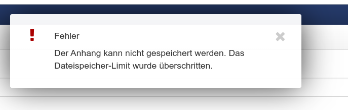 Das Höchstmaß an möglichen Anhängen ist erreicht. Ich könnte die Daten löschen um Platz zu schaffen, damit würden aber auch alle Signaturen gelöscht. Daher warte ich damit, bis die meisten Mitarbeiter aus dem Urlaub zurück gekommen sind, damit sie Ihre Signaturen sichern können. Ich bitte dringlichst darum tunlichst keine Anhänge in Terminen zu speichern, sondern die Dateien in der Nextcloud zu speichern (was bei geteilten Dokumenten sowieso geschehen sollte) und im Termin einen Link darauf zu setzen. Bis ich die Dateien gelöscht habe, bietet sich sowieso kein anderer Weg an! *** This bug has been marked as a duplicate of bug 1977 ***