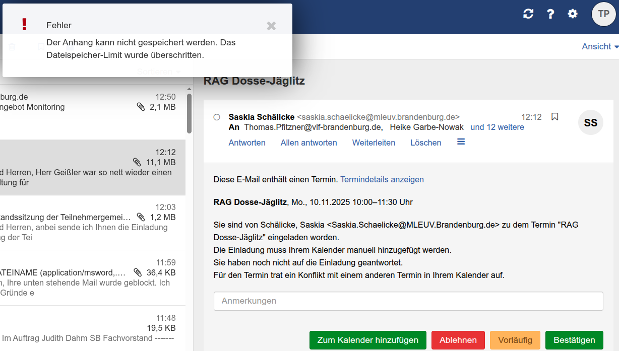 Created attachment 2089 [details] screenshot OX Mail Hallo Uwe, ich kann seit einiger Zeit keine externen Terminvorschläge mehr per Verlinkung in den Kalender übernehmen. Grund ist wohl ein Mangel an Speicherplatz wegen des Anhangs.Siehe screenshot. Da kannst Du doch sicher etwas machen. Meld Dich mal. Danke Dir!