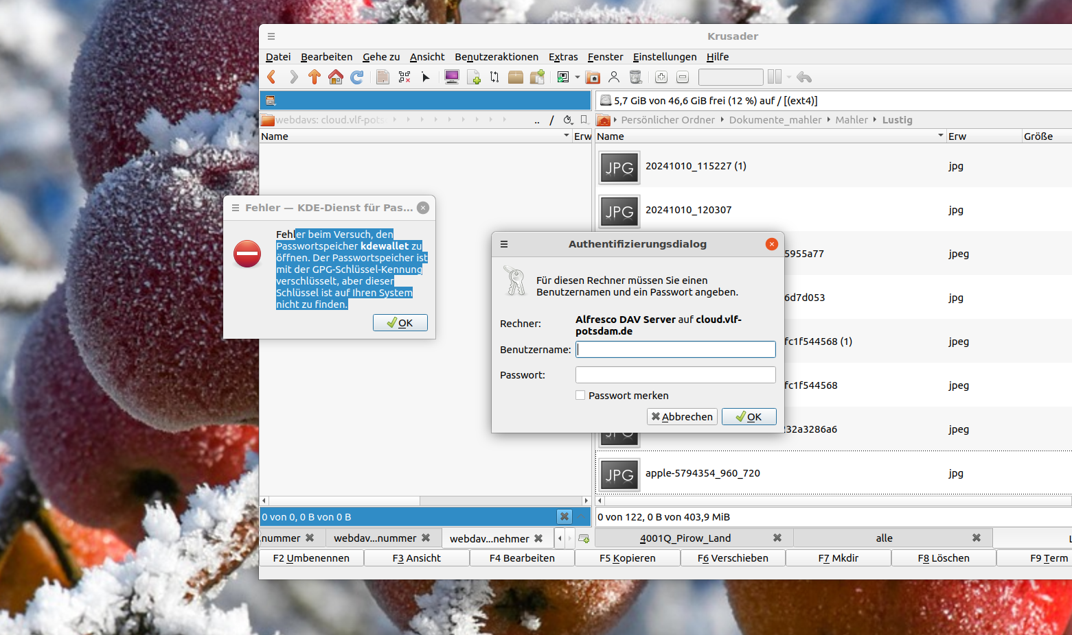 Created attachment 2158 [details] Fehlermeldung Krusader Nach morgentlicher Anmeldung und Öffnen des Krusader erscheinen täglich diese Meldungen (im Anhang...) Nach 10 mal klicken ist das Feld dann weg und die Anmeldemaske erscheint. Anmelden klappt dann.