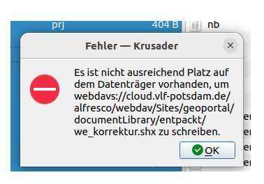 Created attachment 2234 [details] Server 210_Meldung über fehlenden Speicherplatz ich möchte Dateien auf dem Server 210 austauschen - löschen ist kein Problem - Dateien (mit vergleichbarer Dateigröße) ablegen bringt die Meldung, dass nicht ausreichend Platz auf dem Datenträger vorhanden ist (siehe Anhang) - ich habe versucht nur eine der Dateien (4 kB) abzulegen, selbe Meldung - das ist schon mal aufgetreten und am nächsten Morgen konnte ich die Dateien ablegen, heute nicht - ich bin Eigentümerin dieses Verzeichnisses bzw. Gruppe bo