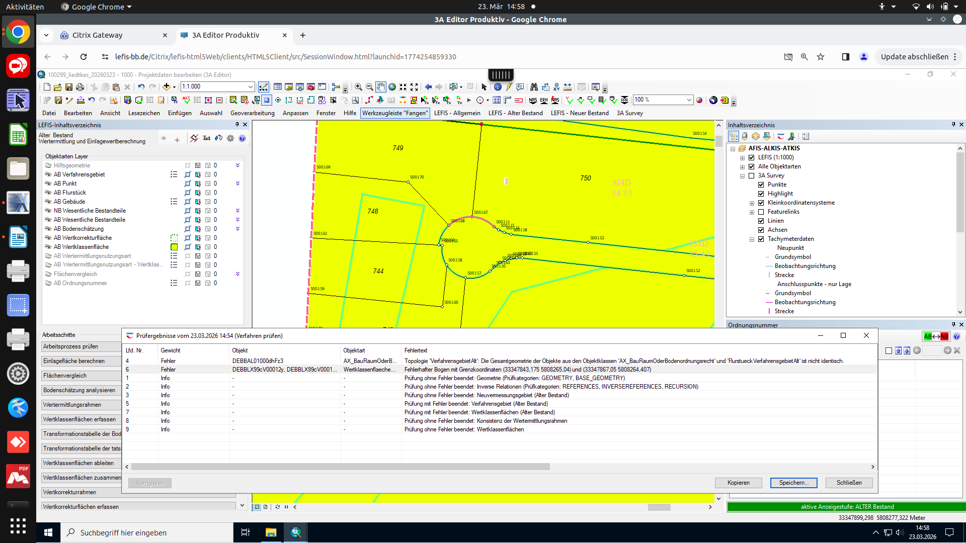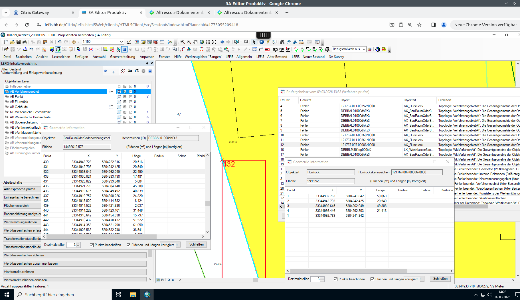 Created attachment 2269 [details] Punkte Überblick: Bei der Nachmigration vom HP2-Verfahren 100299 Damsdorf besteht der Fehlertext: Topologie 'VerfahrensgebietAlt': Die Gesamtgeometrie der Objekte aus den Objektklassen 'AX_BauRaumOderBodenordnungsrecht' und 'AX_Flurstueck' ist nicht identisch > s. vlf-Bug 2333 Um den zu Beheben habe ich einen Punkt im Verfahrensgebiet gelöscht und den Punkt 432 im Anhang Punkte auf den Punkt 3 im Verfahrensgebiet verschoben. Beim FFA erscheint „Kein fortgeführten Objekte in der Projektdatenbank vorhanden“ trotz dieser Änderung. Das gehört doch zum FFA, oder nicht? Und falls das fälschlicherweise nicht rückgespeichert wird, kann dass der Grund sein, warum ich trotz Nicos Änderungen im vlf-Bug 2327 - Topologie ´VerfahrensgebietAlt´: Die Gesamtgeometrie der Objekte aus den Objektklassen ´VerfahrenVerfahrensgebietAlt´ und ´AX_Flurstueck´ ist nicht identisch > Kommentar 5 und keinen Fehlern in seinem Fehlerprotokoll weiterhin in meinem Projekt Fehler habe? Vorgehen zum Reproduzieren: 1) zu EDBS-Geometrie tauschen 2) im AB Verfahrensgebiet ein Punkt löschen und einen verschieben 3) Geometrie tauschen 4) FFA Angetroffener Effekt: Kein fortgeführten Objekte in der Projektdatenbank vorhanden Erwarteter Effekt: FFA Zusätzliche Information: HP2-Verfahren Damsdorf Mein Projekt 100299_liedtkes_20260305