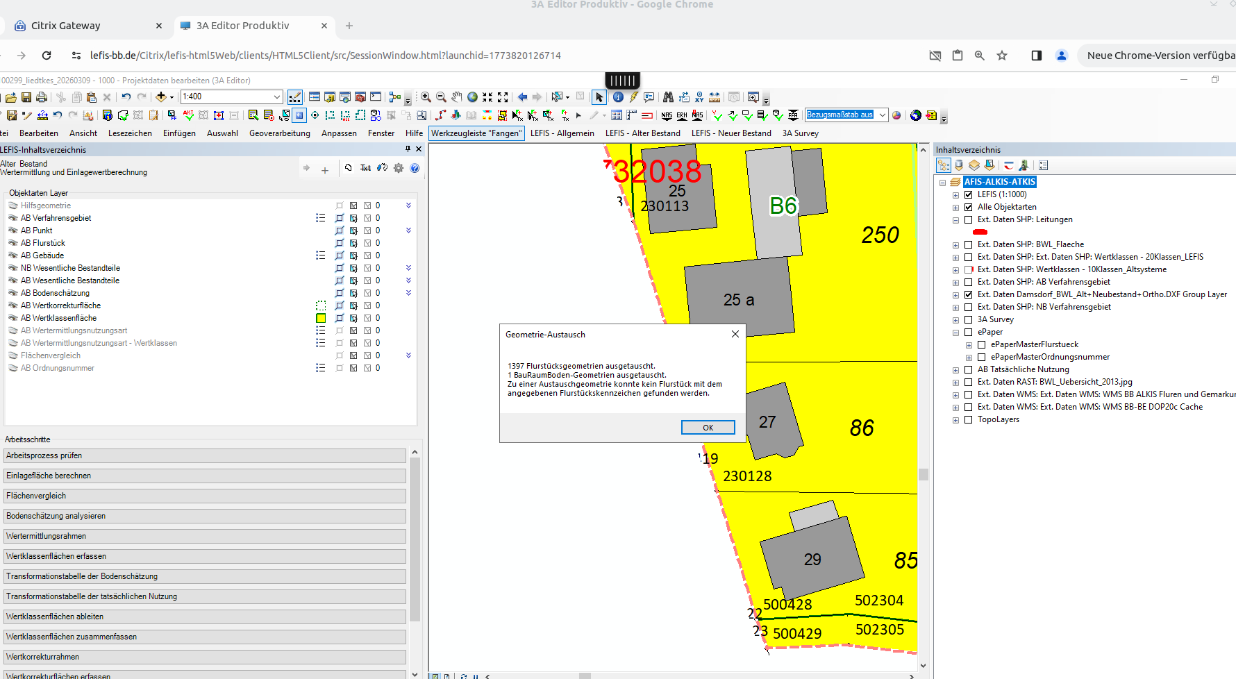 Ich habe beide Wertklassen um den Bogen aufgelöst und neu erzeugt. Der Bogenfehler tritt nicht mehr auf. Für diese beiden Flächen müsste eine neue Einlagewertberechnung durchgeführt werden.