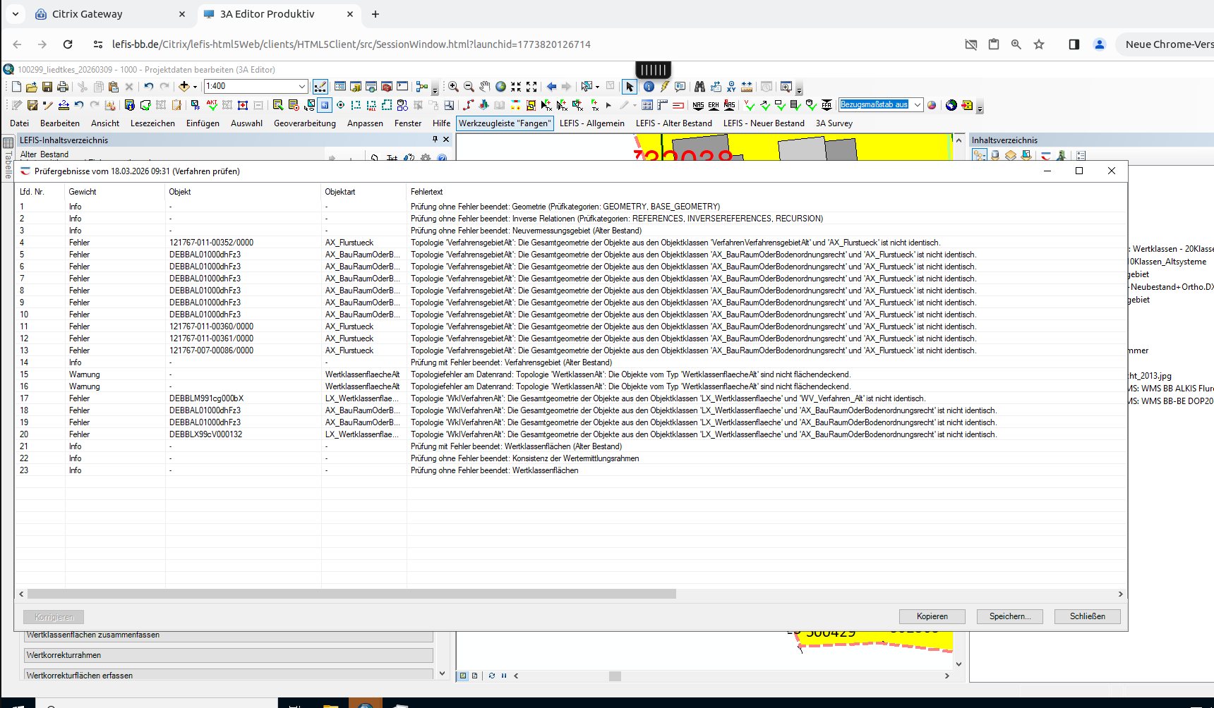 Die Fehler: "Topologie 'VerfahrensgebietAlt': Die Gesamtgeometrie der Objekte aus den Objektklassen 'AX_BauRaumOderBodenordnungsrecht' und 'AX_Flurstueck' ist nicht identisch" wurden korrigiert und in die DHK erfolgreich fortgeführt. Die Fehlermeldungen zu den Wertklassenflächen kannst du selbstständig bearbeiten. Hierfür wieder in die EDBS-Geometrie tauschen und die Fehler der Wertklassen korrigieren. Es besteht weiterhin ein Fehler zu einem Flurstück und dem Verfahrensgebiet. Dieser hat keinen Einfluss auf deine Berechnungen (bereits getestet) und kann ignoriert werden. Eine Beseitigung unsererseits war nicht möglich. Bitte schließe den BUG, wenn du deine Korrekturen vornehmen konntest. BUG 2333 wird geschlossen. Weitere Änderungen an den Objekten AB_Verfahrensgebiet und AB_Flurstück der EDBS Geometrien vom LEFIS-Admin korrigieren lassen.