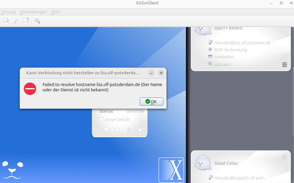 Created attachment 2289 [details] Bildschirmfoto mit Fehlermeldung Nach Laptoptausch Probleme mit dem X2Go Zugang auf Potsdam, X2Go Zugang ABO 11 extern und x2Go Zugang Sicad extern. Anmeldung funktioniert nicht. Es kommt Fehlermeldung wie auf dem Bildschirmfoto. Danke schon mal im voraus für die Bearbeitung